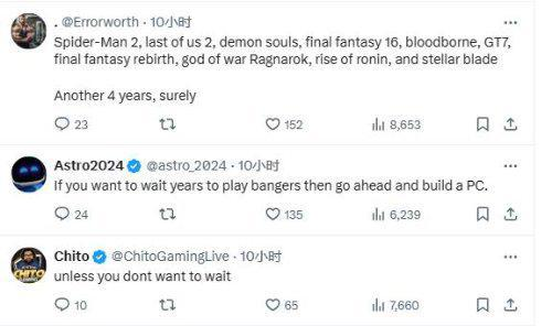 不过也有玩家列举了目前仍为(或即将发售)PS独占的游戏列表——包括《漫威蜘蛛侠2》《最后生还者2》《恶魔之魂》《最终幻想16》《血源》《GT7》《最终幻想7:重生》《战神诸神黄昏》《浪人崛起》以及《星刃》等。
