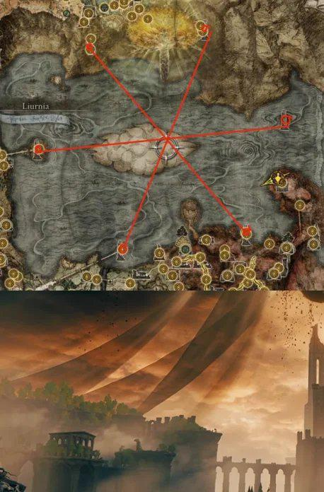 一些《艾尔登法环》的粉丝认为他们已经在地图上找到了进入DLC《黄金树幽影》的位置。在Reddit论坛上,一名玩家试图从《黄金树幽影》官方宣传图中寻找端倪,他发现了宣传图中有类似“缎带”的东西从黄金树上下垂连接,他在游戏地图上标注了每个神授塔的位置,并用线条连接显示了它们之间的汇总点,并认为这里就是进入DLC《黄金树幽影》的位置。