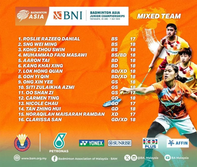 (吉隆坡28日讯)大马羽总今日公布了参加下月参加亚洲青年羽球赛的大马阵容名单,包括混合团体赛和个人赛名单。