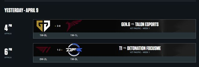 4月9日VCT太平洋赛区:GEN 2-0 TLN;T1 1-2 DFM