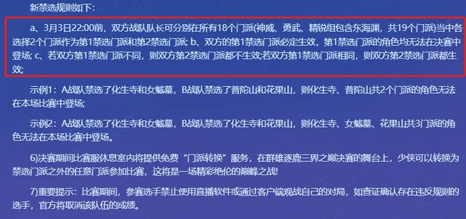 群雄逐鹿冠军杯比赛禁选与其他比赛不同,被禁的2个门派是无法复活的。虽然参赛战队可以通过门派转换的方式补充类似门派,但这也给了对手抓门派克制、阵容克制的机会。