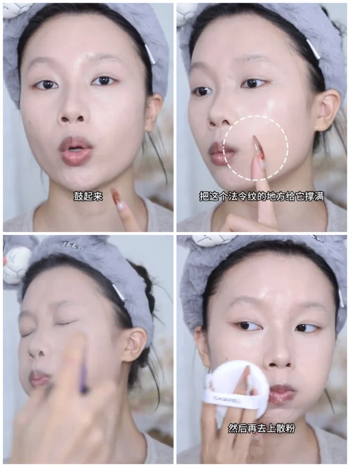 平常粉底液上脸后,最容易在法令纹的位置积线卡纹,让整个人看起来更显老态!想要解决这个问题,我们可以用一个「嘟嘟嘴」的方法来解决~