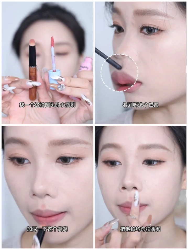我们可以换一个颜色嫩一点的唇釉,然后用一把圆头的唇刷蘸取一点点唇釉的颜色,找到唇峰上方、人中凹陷的“窝”,把唇刷点在上面,加深这个窝。