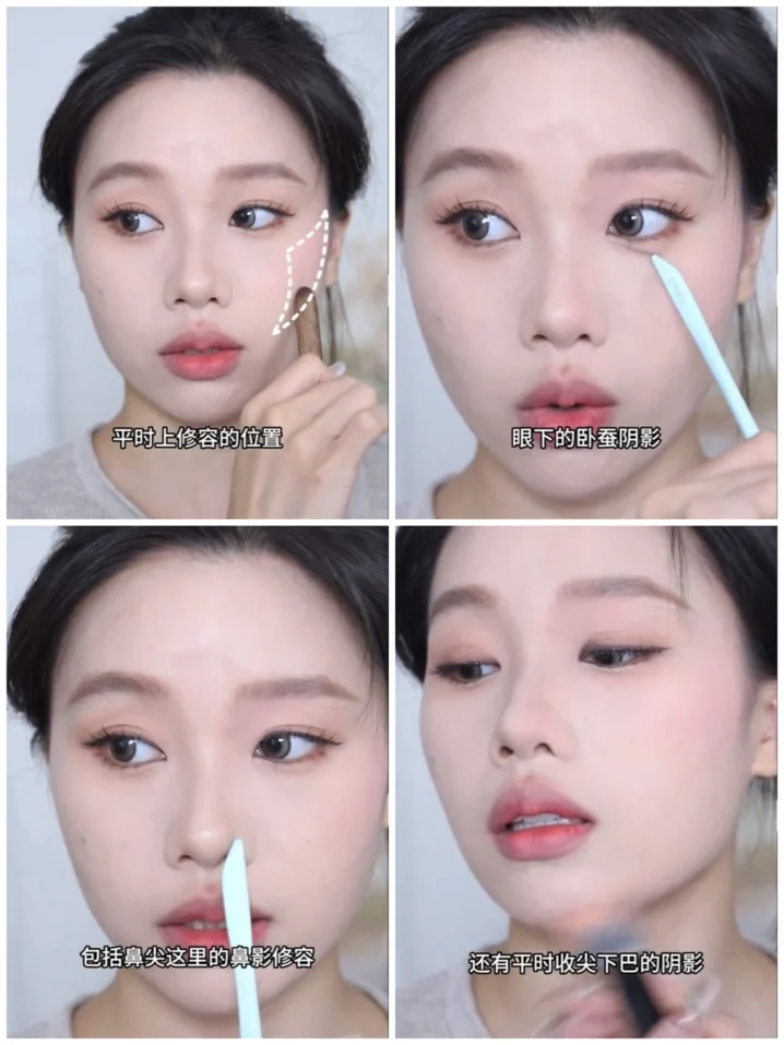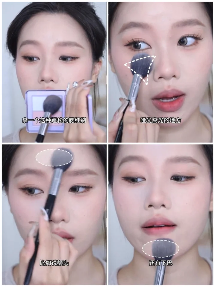 所以我们在打腮红的时候,也要打在这些阴影的位置,如脸侧的修容阴影、鼻影修容、鼻尖修容、眼下卧蚕阴影、下巴以及嘴唇下方的阴影。