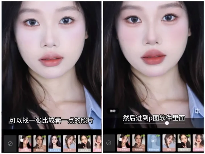 只需要在美图软件导入一张素一点的照片,透过软件的滤镜来查看哪一种妆容适合自己,然后再根据电子版“抄作业”,就可以避免哐哐一顿画最后发现不根本适合自己的尴尬和无力感啦~