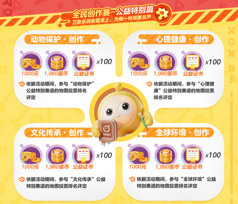 万象乐园有爱至上,“全民创作赛”公益特别篇盛大开幕,邀请创作者关注不同领域,为每一种需要发声。动物保护、心理健康、文化传承、全球环境四大公益特别赛道正式开启,参与即可瓜分现金蛋币,更有机会赢取公益证书,留下属于自己的公益印记!游玩地图投票支持还可获取公益币,用实际行动助力公益基金,让每个乐园足迹都有意义!