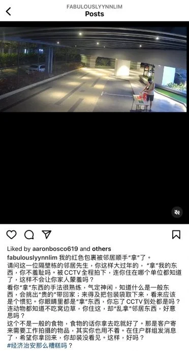 林佩盈发现客户寄来的包裹被邻居顺手“拿”走,要求对方归还,但对方却视而不见,气得晒出监控画面公审。(取自IG)