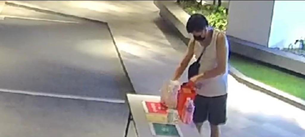 监控画面可见一名穿白色背心的男子到林佩盈居住地单位包裹寄放处翻查包裹内的物品。(IG截图)