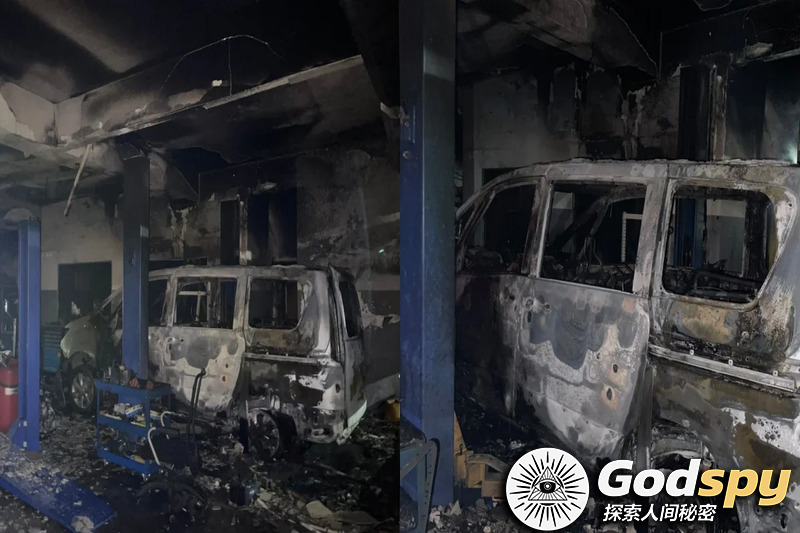 汽车维修中心店面 遭大火烧毁70% , 消拯员赶往现场灭火