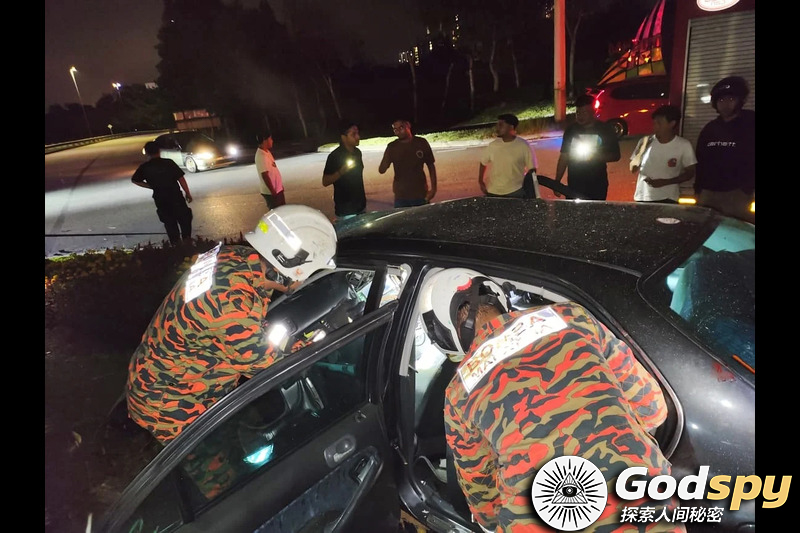 开车失控撞交通圈大树 青年重伤当场亡,消拯员使用特殊工具,救出受困伤者。